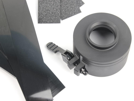 Подгонка под диаметр прицела осуществляется полимерными проставками и антифрикционной лентой, входящей в комплект к каждому адаптеру. Всего в комплекте 4 полимерных ленты разной толщины и 4 антифрикционных ленты с одной клейкой поверхностью, которая наклеивается на полимерную ленту и соприкасается непосредственно с поверхностью объектива, не повреждая его при фиксации.