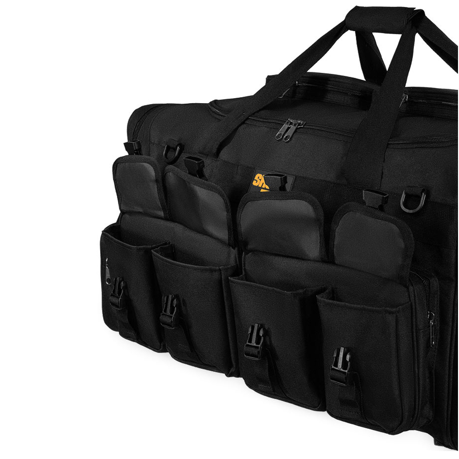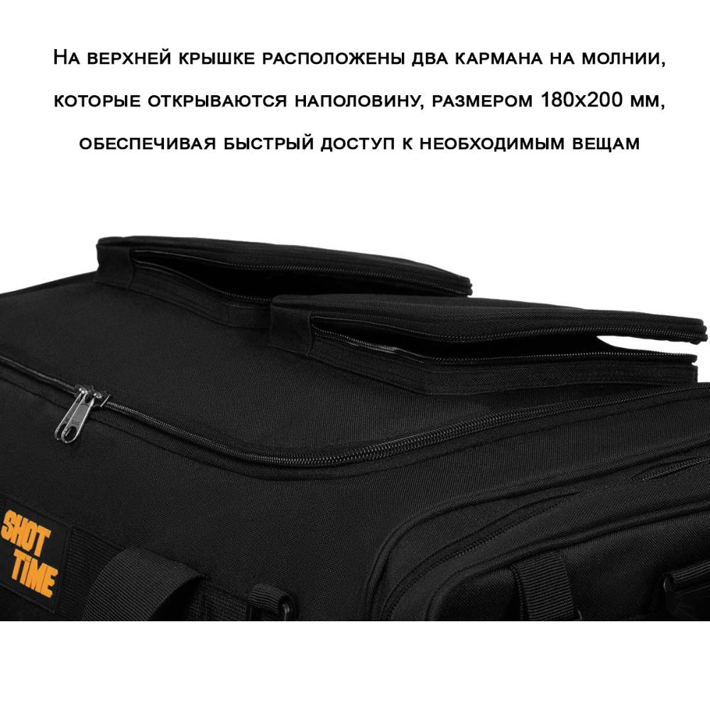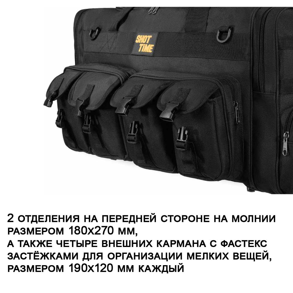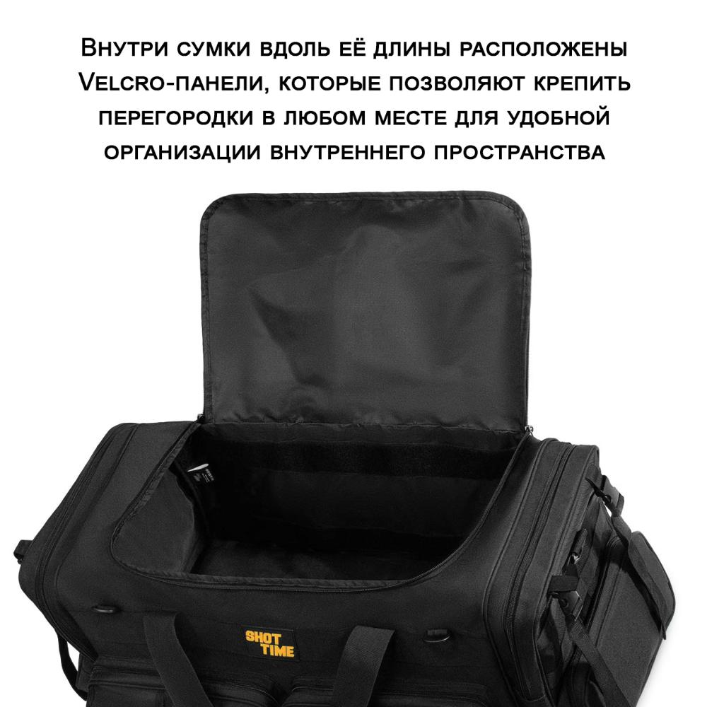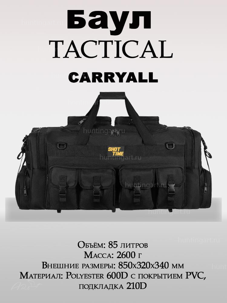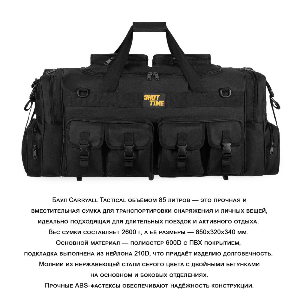 Сумка ShotTime Carryall Tactical имеет объём 85 литров и предназначена для перевозки снаряжения и личных вещей. Она изготовлена из прочного материала 600D с ПВХ покрытием и нейлона 210D, что гарантирует долгий срок службы. Внутри сумки есть съёмные перегородки на липучках, Velcro-панели и система MOLLE для крепления дополнительного оборудования. Регулируемый плечевой ремень с ABS-зажимами и опоры на дне обеспечивают устойчивость и комфорт при переноске. На сумке есть ручка с фиксацией на липучке, а также карманы и отделения для разных вещей.