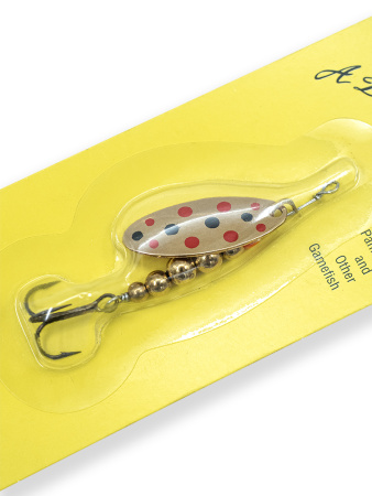 Thomas E.P.Spinn – настоящий убийца для форели и многих других хищных рыб. Высококлассное исполнение лепестка из латуни, скобы лёгкого вращения, цельных латунных шариков (не полых как у дешёвых имитаций) и оси из нержавеющей стали. У этой классической вращающейся блесны лепесток покрыт серебром или золотом с ювелирным качеством. Есть исполнение с черными или красными точками, любо двухцветное без точек.