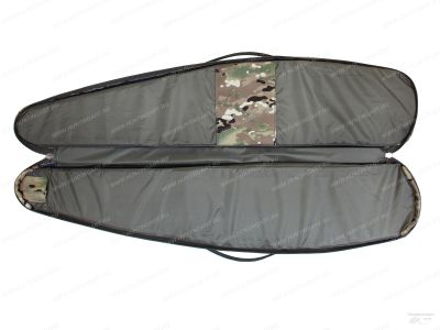 Чехол выполнен из многослойной водонепроницаемой ткани. Наружная ткань имеет мягкую поверхность и абсолютно не шуршит. Внутренняя ткань обеспечивает прочность. Внутри имеется усиление в районе затвора. Сделан карман для ствола и упор для приклада.