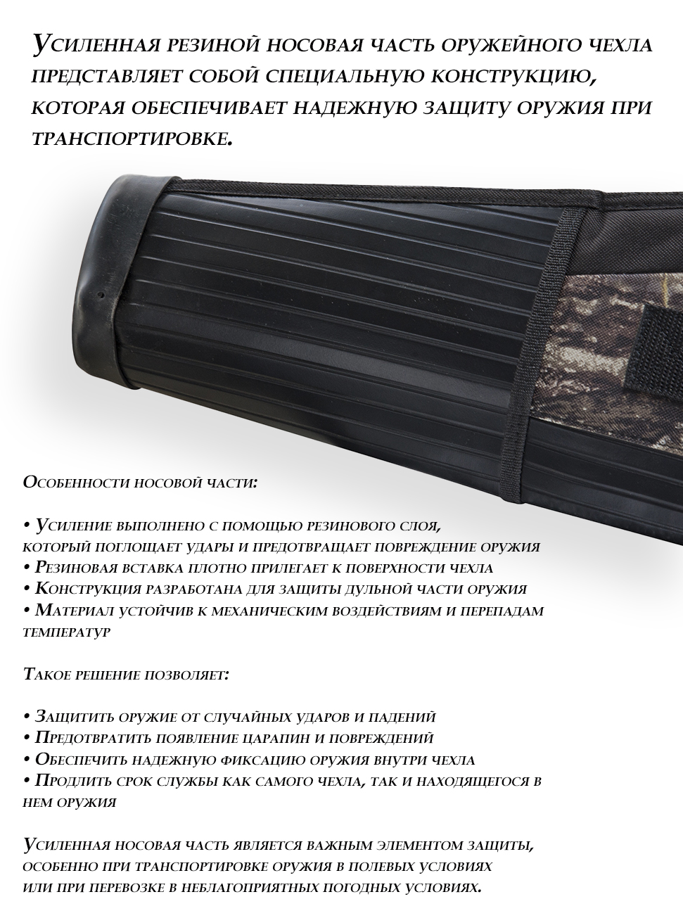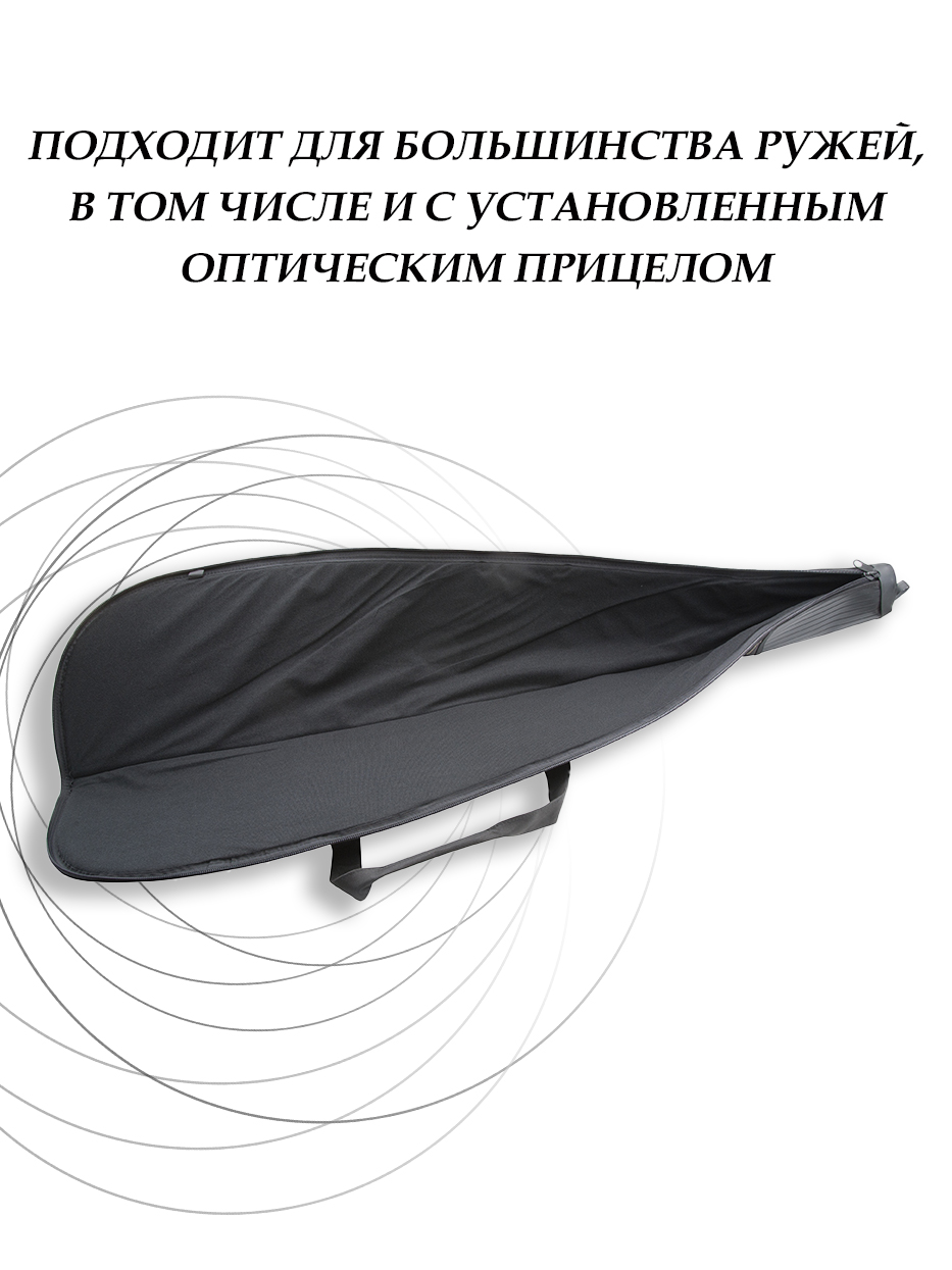 Прочный легкий чехол для оружия из ткани Кордура 600D предотвращающий повреждения оружия. Чехол для оружия имеет прочные ручки для переноски, регулируемый плечевой ремень и надежную молнию. Подходит чехол для большинства ружей, в том числе и с установленным оптическим прицелом. Снаружи имеются три кармана для мелочей. Носовая часть чехла усилена резиной.