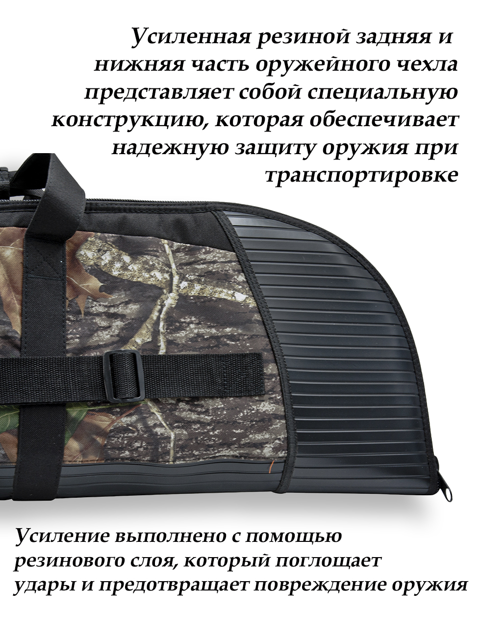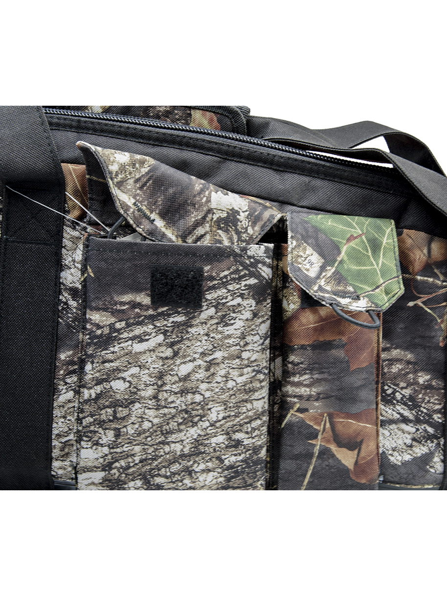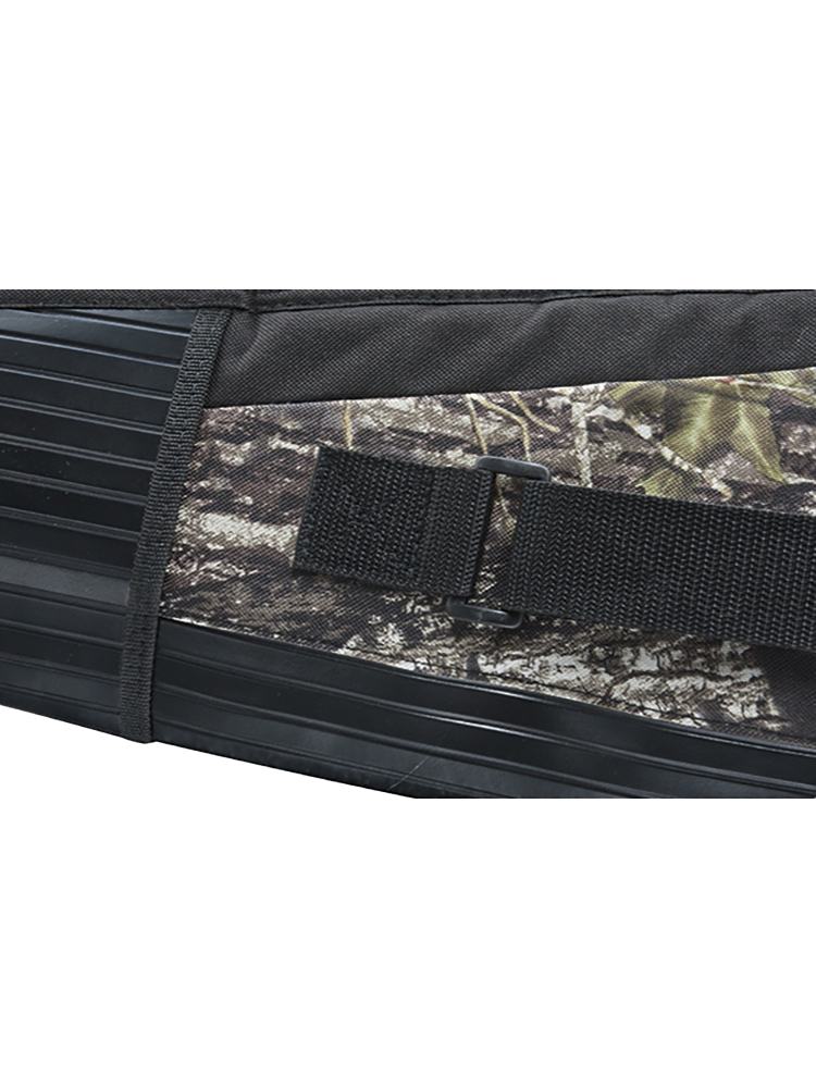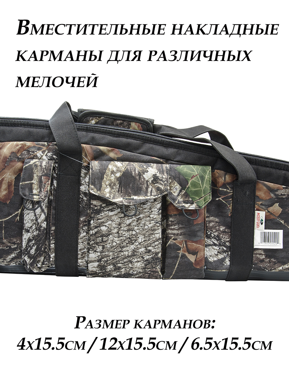 Чехол из водонепроницаемого материала Эндура 600D представлен в камуфляжной расцветке Mossy Oak. У модели есть короткие ручки и плечевой ремень, который регулируется по длине. На лицевой стороне пришито три кармана. Размеры чехла — 12226,4 см при ширине 3,6 см.