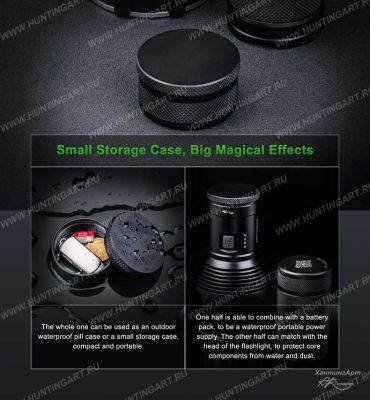 Включение/ выключение, смена режима фонаря кнопочное "DUO switch". Кнопка удобная, большая и находится на трубке фонаря. Кнопка может нажиматься щелчком или легким касанием. Щелчком – для быстрого включения и выключения, а касанием – для переключения режимов. А также есть небольшой отсек для небольших мелочей.