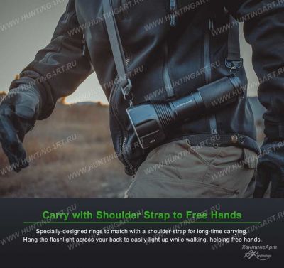 Передняя часть фонаря выполнена с защитными («тактическими») выступами. Головная часть фонаря не перегревается за счет ребер охлаждения. Там же кольцо для крепления наплечного ремня. Свет у фонарика нейтрально-холодный, за яркость отвечает XHP70B. Заявленная дальнобойность 600 м при мощности фонаря 3500 люмен на 3 часа.