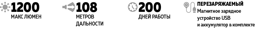 Это классический мультифонарь 3 в 1 с широким светом и простым интуитивно понятным переключением режимов. Яркость света данной модели достигает 1200 люмен на расстоянии до 108 метров. Подходит для тех, кому нужен фонарь с базовым набором вариантов яркости и максимально простым управлением. Аккумулятор 18650 Li-Ion емкостью 3200 мАч заряжается в фонаре с использованием специального магнитного USB-кабеля.
