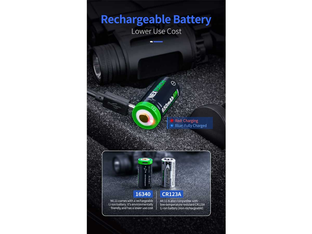 - Аккумулятор: 1 x 16340 или 1 x CR123a