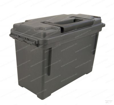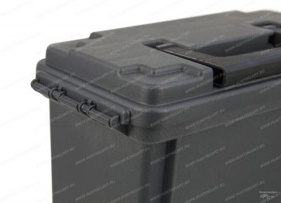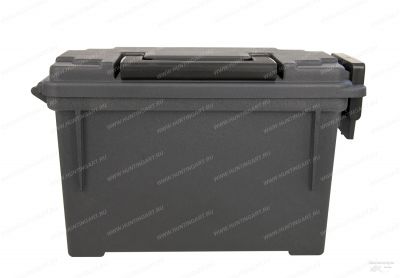 Изготовлен ящик из особенно прочного и износостойкого пластикового композитного материала, черного цвета. Ящик закрывается жесткой крышкой на удобный боковой замок с возможностью повесить навесной замок (обязательное требование при транспортировке патронов в самолёте).