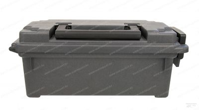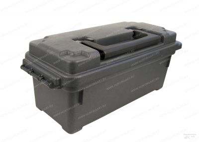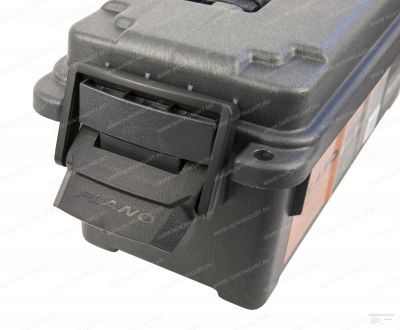 Выполнен небольшой ящик из противоударного пластика, черного цвета (темно-серый). Ящик для патронов оснащен удобным и надежным боковым замками-защелкой Lockable, с возможностью повесить дополнительный навесной замок (обязательное требование при транспортировке патронов в самолёте). Крышка запирается плотно (без уплотнителя). Имеется удобная складывающаяся ручка для переноски. Ящик можно брать с собой в лодку, скрадок, в машину, не заботясь о дополнительной сохранности патронов и принадлежностей.