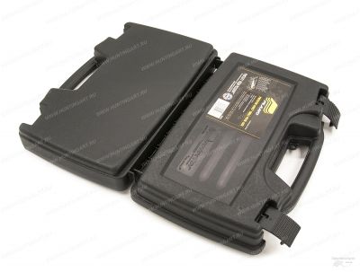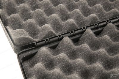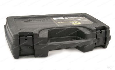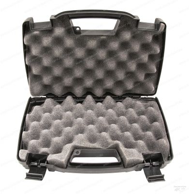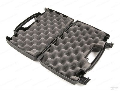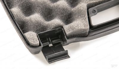Выполнен из ударопрочного пластика ABS с высокой химической стойкостью. Ребра жесткости обеспечивают устойчивость к деформирующим нагрузкам, сохраняют форму и целостность кейса под тяжелым грузом. Внутри предусмотрено амортизирующее покрытие с рельефной поверхностью. По центру основания размещено специальное крепление размерами под спусковую скобу, которое фиксирует пистолет в неподвижном положении. Закрывается кейс парой надежных защелок по обе стороны рукояти.
