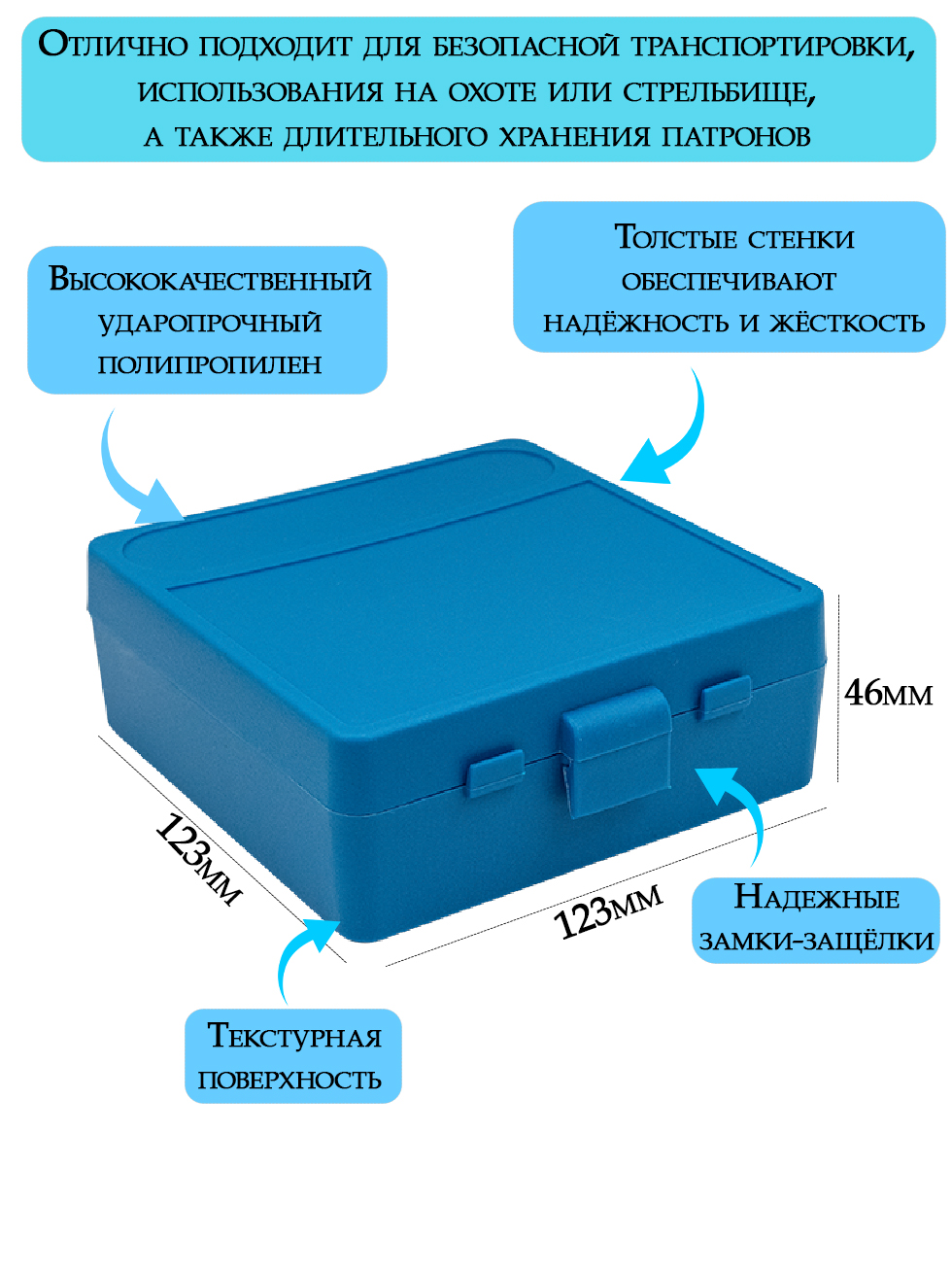 В отличие от стандартных картонных упаковок, кейс обеспечивает комплексную защиту боеприпасов от механических повреждений, влаги и пыли благодаря ударопрочному полипропилену цвета «синий» и толстым стенкам конструкции. Надёжными боковыми замками-защёлками, что гарантирует сохранность содержимого, а текстурная поверхность предотвращает выскальзывание кейса из рук и сохраняет привлекательный внешний вид длительное время.