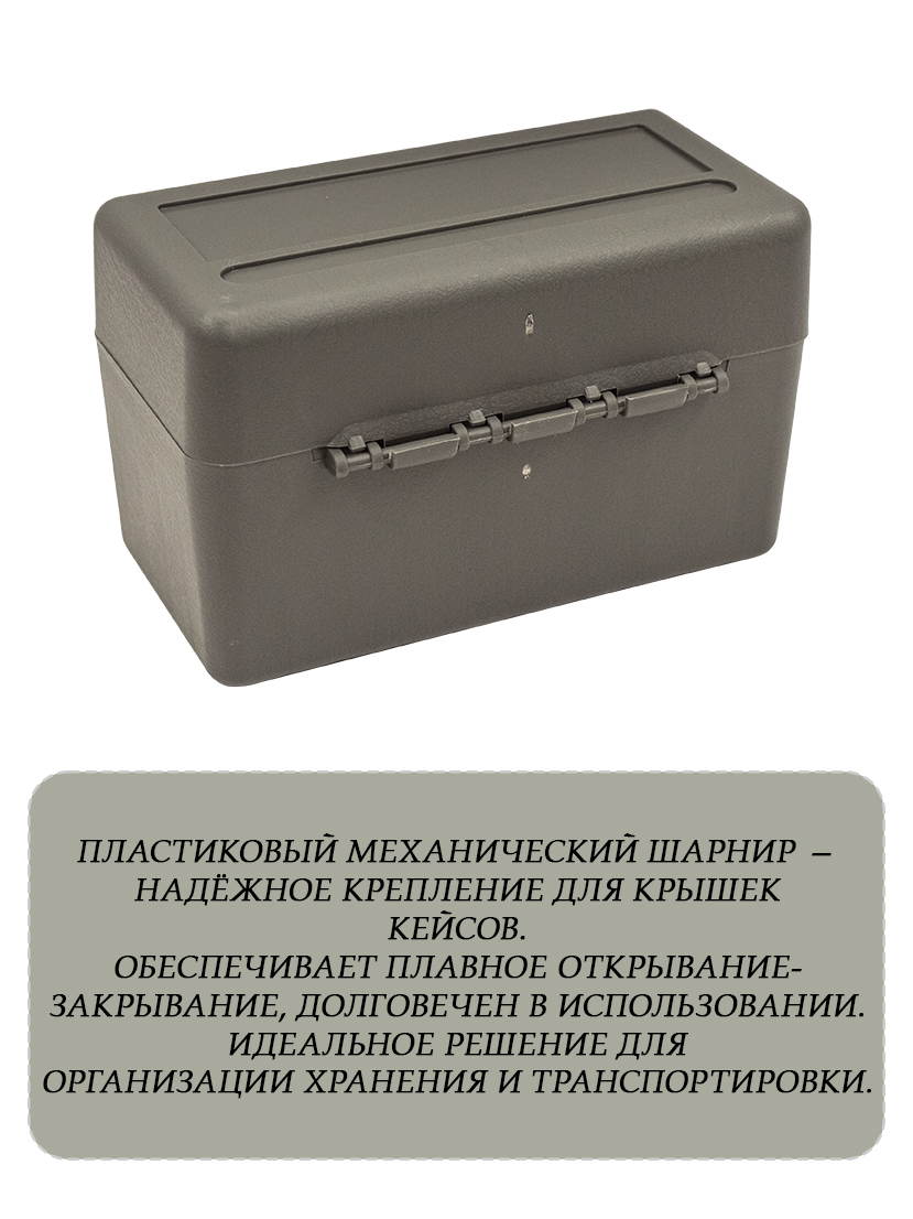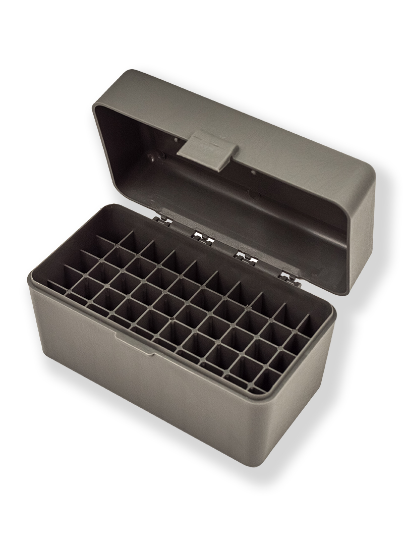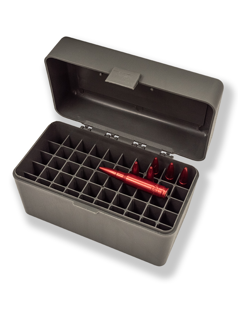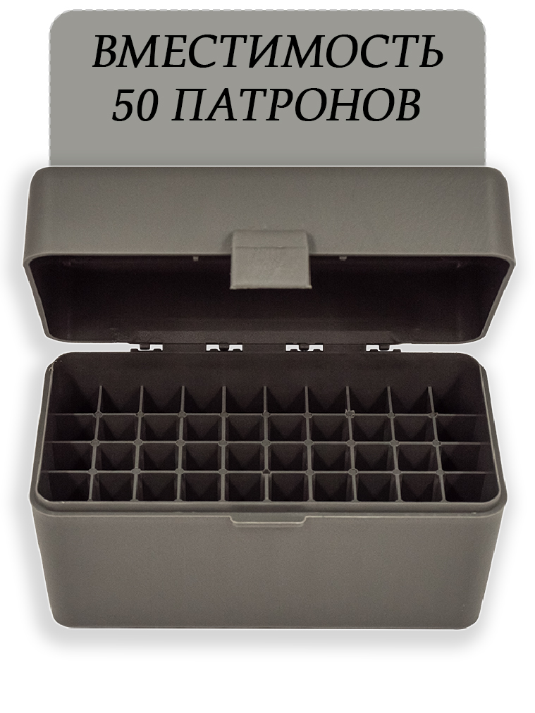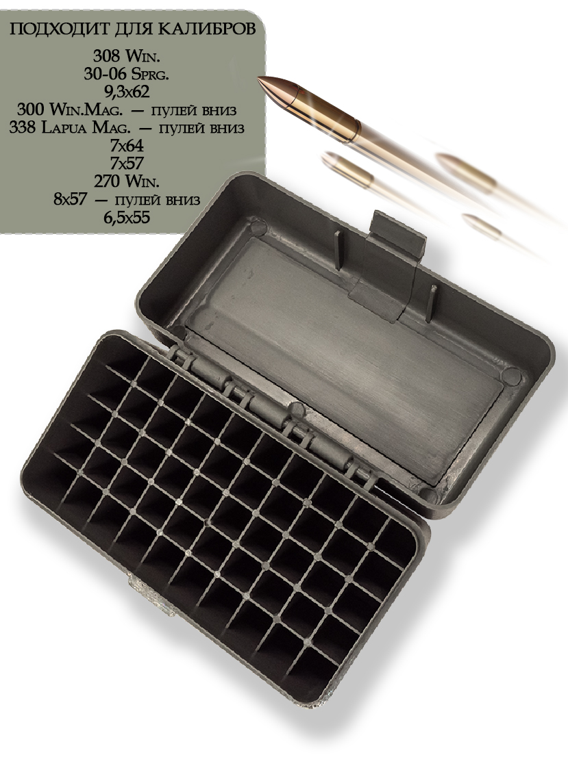 Кейс — практичное решение для хранения и транспортировки патронов калибров 308 Win, а также других аналогичных боеприпасов. Вместительность кейса составляет 50 патронов, каждый из которых размещается в индивидуальной ячейке, что исключает их повреждение при транспортировке и хранении.