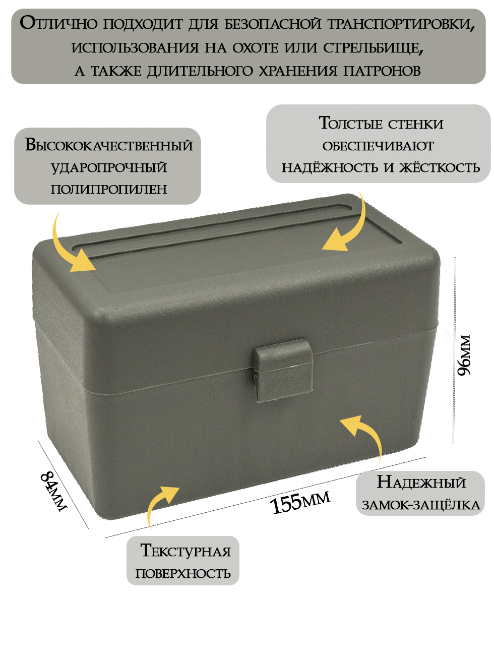 Непрозрачный корпус эффективно скрывает содержимое от посторонних глаз, а специальная маркировка на этикетке указывает подходящие калибры. Удобная система пазов на крышке и дне позволяет штабелировать кейсы при хранении в оружейном сейфе, что особенно важно для организации пространства. Это компактное и функциональное решение станет незаменимым помощником для охотников, стрелков и коллекционеров, ценящих безопасность и порядок в хранении боеприпасов.