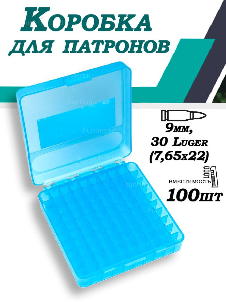 Кейс вместимостью 100 патронов. Калибры 9mm, 380 ACP, 30 Luger, 9mm Makarov. Внешние размеры 120*120*35 мм.
