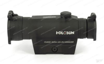 Модель HS402C является коллиматорным прицелом с маркой «красная точка». Имеет двойной источник питания, быстросъемный флажковый кронштейн и таким расположением батарейки, которое не препятствует обзору и присутствует датчик движения, который включает прицел. Батарейный отсек внешний имеет форму лотка, в который вкладывается батарейка и задвигается в корпус коллиматора. В обычных условиях прицел питается от солнечного элемента. В условиях слабой освещенности, когда солнечной энергии недостаточно, нехватка энергии компенсируется батарейкой. Возможно переключение между двумя режимами работы прицела – автоматическим и ручным.