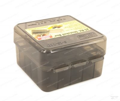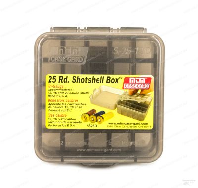 Бокс (коробка) MTM S25D-41 предназначен для хранения и безопасной переноски (транспортировки) 25 охотничьих боеприпасов к гладкоствольному оружию .12, .16, .20 калибра включая Magnum с максимальной высотой патрона 76 мм.