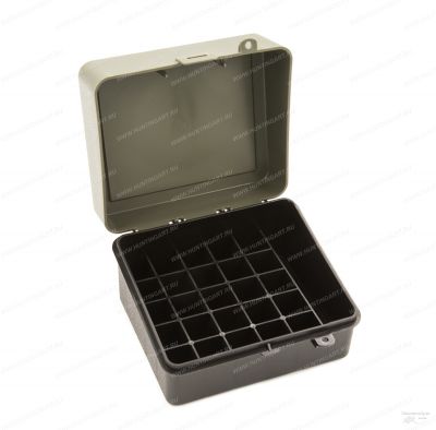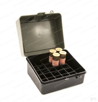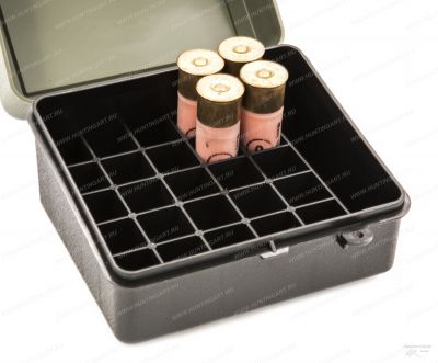 Коробка пластиковая на 25 патронов для гладкоствольного оружия .12 - .16 калибра, длиной до 89 мм. Внутри бокса есть отделение для мелких предметов. На коробке имеются ушки для наружного замка. Изделие выполнено из противоударного пластика.
