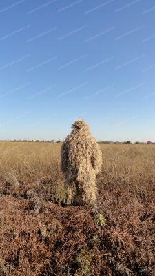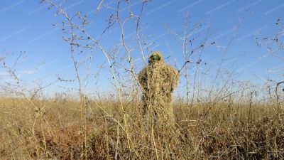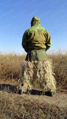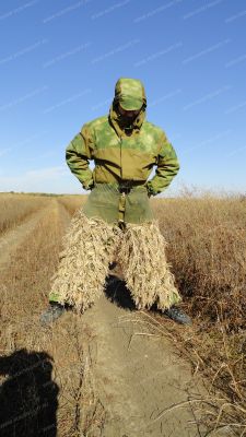Верхняя часть представляет собой короткую куртку (ниже пояса) с капюшоном который имеет утяжки по объему головы и по овалу лица, с противомоскитной сеткой. Основу куртки составляет трикотажная сетка Полиэстер 100%. На основу нашиты маскирующие элементы из джутовой нити. Так же на рукава, плечи и на капюшон нашиты петли из резинок для создания дополнительной маскировки на местности что позволяет наиболее эффективно сливаться с окружающей местностью и максимально размыть силуэт человека. Альтернативный выбор застежки (пуговицы, завязки).