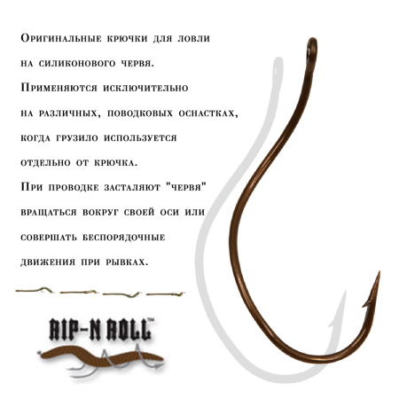 Оригинальные крючки для ловли на силиконового червя. Применяются исключительно на различных, поводковых оснастках, когда грузило используется отдельно от крючка. При проводке засталяют "червя" вращаться вокруг своей оси или совершать беспорядочные движения при рывках.