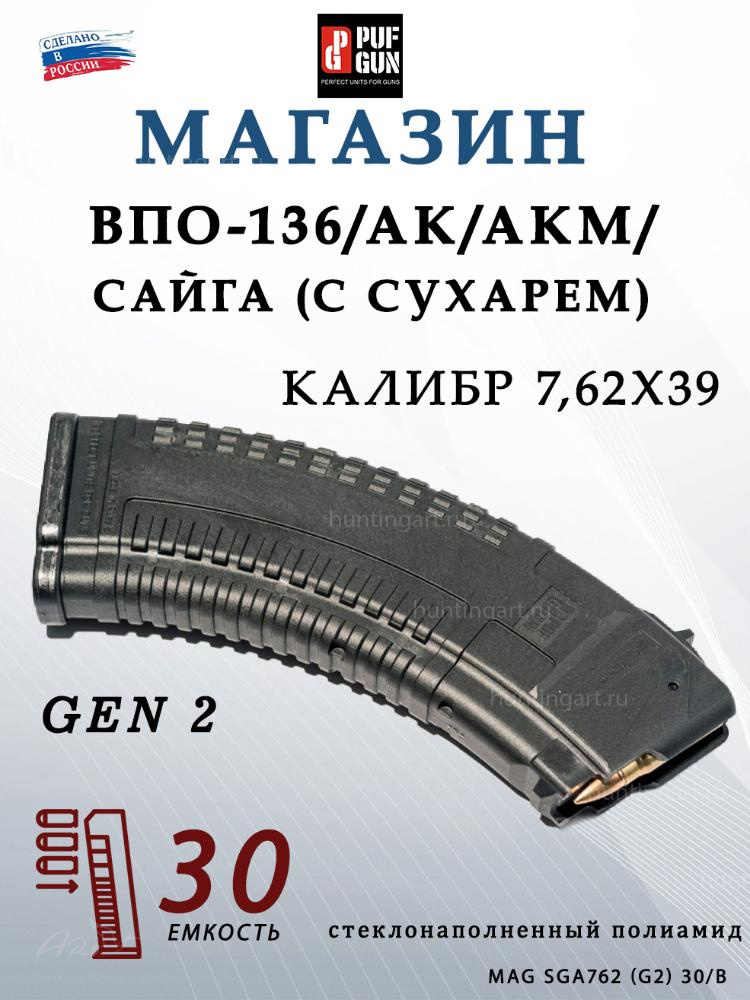 Магазин Pufgun на ВПО-136/АК/АКМ/Сайга (с сухарем) калибра 7,62x39, 30 патронов, Gen2 (второе поколение) от Российской компании Pufgun.