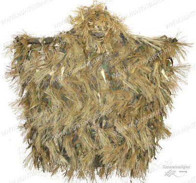 Маскировочная накидка Егерь пошита из камуфляжной сетки с маскирующими элементами из лыка и ткани, окрашенными в натуральные цвета под конкретные условия охоты. Контур маскировочной накидки для охоты и ее цвет имитируют натуральную растительность, что позволяет максимально реализовать маскировочные свойства костюма для охоты на открытой местности. Так же имеется возможность использовать охотничью маскировочную накидку на охоте как скрадок, растянув на ветках деревьев или кольях. Для удобства передвижения по бокам маскировочная накидка застёгивается на пуговицы. Каждый рукав маскировочной накидки для охоты имеет специальные фиксаторы для запястья. Наличие капюшона у маскировоный накидки Егерь позволяет не приобретать дополнительно маскирующий головной убор. Маскировоная накидка для охоты упаковывается в торочёк-сетку, которую возможно использовать для переноски дичи.