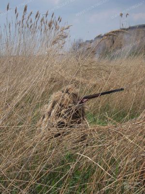Маскировочная накидка(пончо) "Егерь" , сделана из сетки камуфляжного цвета ,пришитыми к ней кусочками зелёной ткани и натурального лыка(окраска под камыш).Накидка(пончо)-безразмерна. Создаёт 3-D объём.Так же есть возможность растянуть её квадратом и сделать укрытие(скрадок).Поставить на колья или на ветки деревьев.В собранном виде занимает мало места и упаковывается в удобный мешок для переноски.