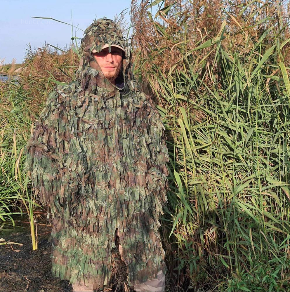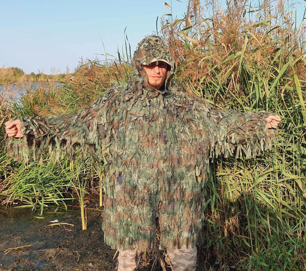 Легкий, дышащий масхалат с капюшоном из полиэфирной ткани. Большое количество лоскутов ткани нашитых на основу создают эффект объемного камуфляжа, маскируя фигуру человека. Застегивается халат при помощи молнии. По бокам два отверстия для доступа к карманам. На рукавах манжеты. Халат прост в обслуживании, не гниет, не бликует, не впитывает влагу, хорошо "дышит", мало весит и достаточно компактный.