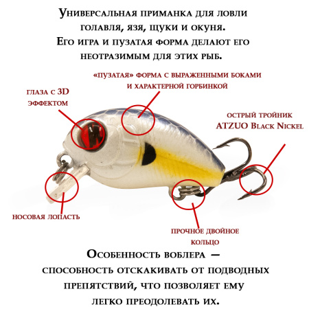 Воблер Nano Crank для современного рыбака. Обладает качествами классических приманок, а также инновационным дизайном (окрас и глаза с 3D эффектом). И вот эти самые колебания-игра , плюс его симпатичная «пузатая» форма с выраженными боками и с характерной горбинкой, делают воблер просто неотразимым для голавля, язя, щуки и окуня. Один из самых универсальных воблеров. Другая заявленная особенность данного воблера – способность отскакивать от подводных препятствий. Действительно, его носовая лопасть устроена таким образом, что после того, как воблер задевает за дно, камни или бревна, он не зарывается в препятствие, а запросто перепрыгивает его.