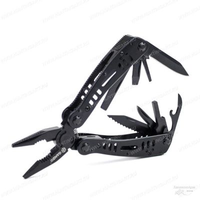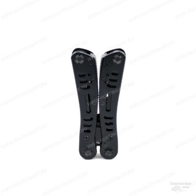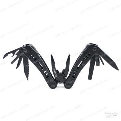 Этот инструмент поможет вам устранить неисправности велосипеда, туристического снаряжения, экипировки охотника или рыбака. Да и в домашнем быту он пригодится не единожды. Одно из основных преимуществ такого мультитула — наличие полноценных плоскогубцев с мощными подпружиненными губками, встроенными кусачками для проволоки и ребристым захватом для предметов круглой формы. Помимо того, в пустых изнутри рукоятках мультитула размещаются открывалка для бутылок, две плоские и крестовидная отвертки, шило (его же можно использовать в качестве маленького ножа), линейка, на обратной стороне которой — напильник, два клинка (гладкий и с серрейторной заточкой). Также имеется держатель для бит с квадратным сечением. Сами же биты прилагаются в отдельном органайзере: 8 сменных насадок и переходник. Хотя мультитул и сделан из нержавеющей стали, на инструменты нанесено стойкое черное покрытие, которое играет роль дополнительного барьера для коррозии. К тому же, благодаря этому покрытию, мультитул — матовый и выглядит очень стильно. Для хранения мультитула вместе с битами, предусмотрен тканевый чехол.