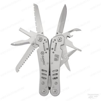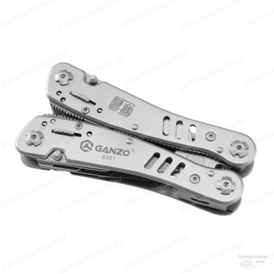 MultiToolGanzo G301 состоит из таких инструментов: Плоскогубцы и кусачки (подпружиненные для более удобной работы); Отвертка (минусовая); Нож с волнистой заточкой (серрейтор); Нож для открывания консервов и банок; Открывалка для бутылок; Приспособление для снятия изоляции; Приспособление для захвата гаек; Ножницы; керн (шило); Кольцо для подвешивания; Двухрядная пила; Бит-держатель (на магните) и 12 насадок.