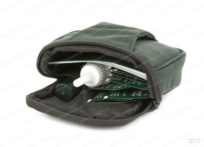Набор включает в себя: футляр для ношения на ремне, влажные чистящие салфетки, щеточку для очистки, чистящую жидкость и салфетку из микрофибры.