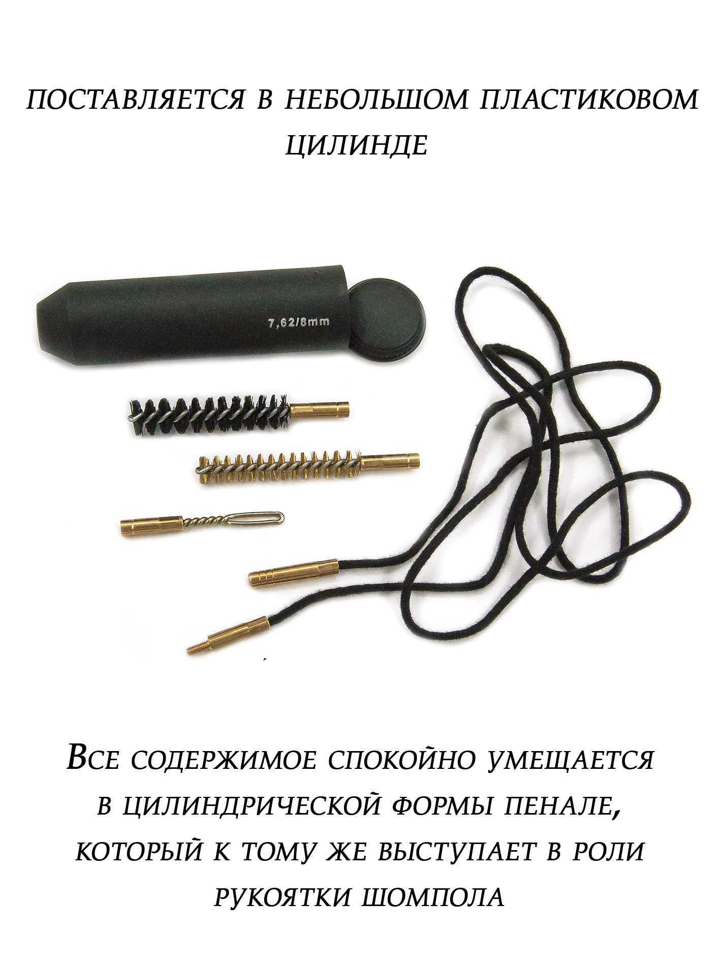 Набор для чистки поставляется в небольшом пластиковом цилинде. Все содержимое спокойно умещается в цилиндрической формы пенал, который к тому же выступает в роли рукоятки шомпола, что очень удобно и практично в полевых условиях. Цилиндр небольшой всего 10 см длиной, за счет чего занимает очень мало места.