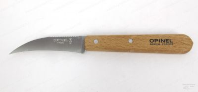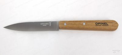 Рукоять эргономической формы и изготовлена из дерева бук, она удобно лежит в руке и отличается лаконичным дизайном - отличительной чертой Opinel. На лезвии выгравирована маркировка производителя: эмблема в виде увенчанной короной благословляющей руки, зарегистрированная торговая марка компании с 1909 года.
