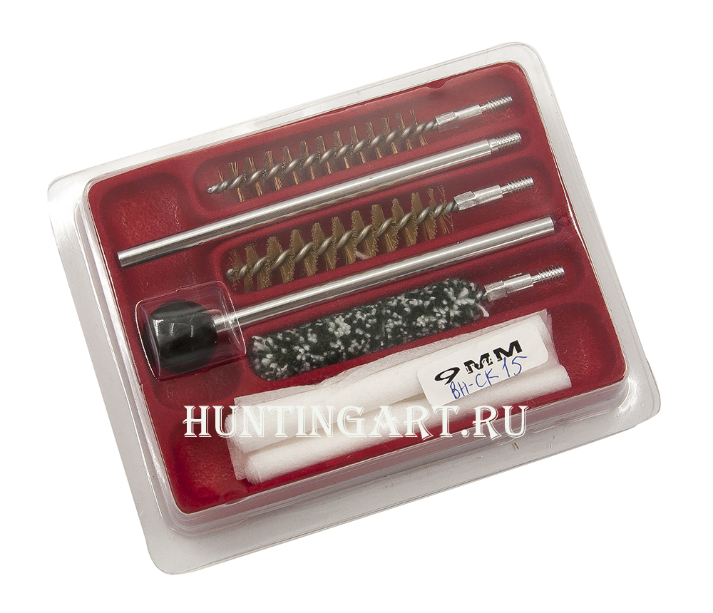 Компактный набор для чистки пистолетов калибра 9 мм, поставляется в пластиковой упаковке.
