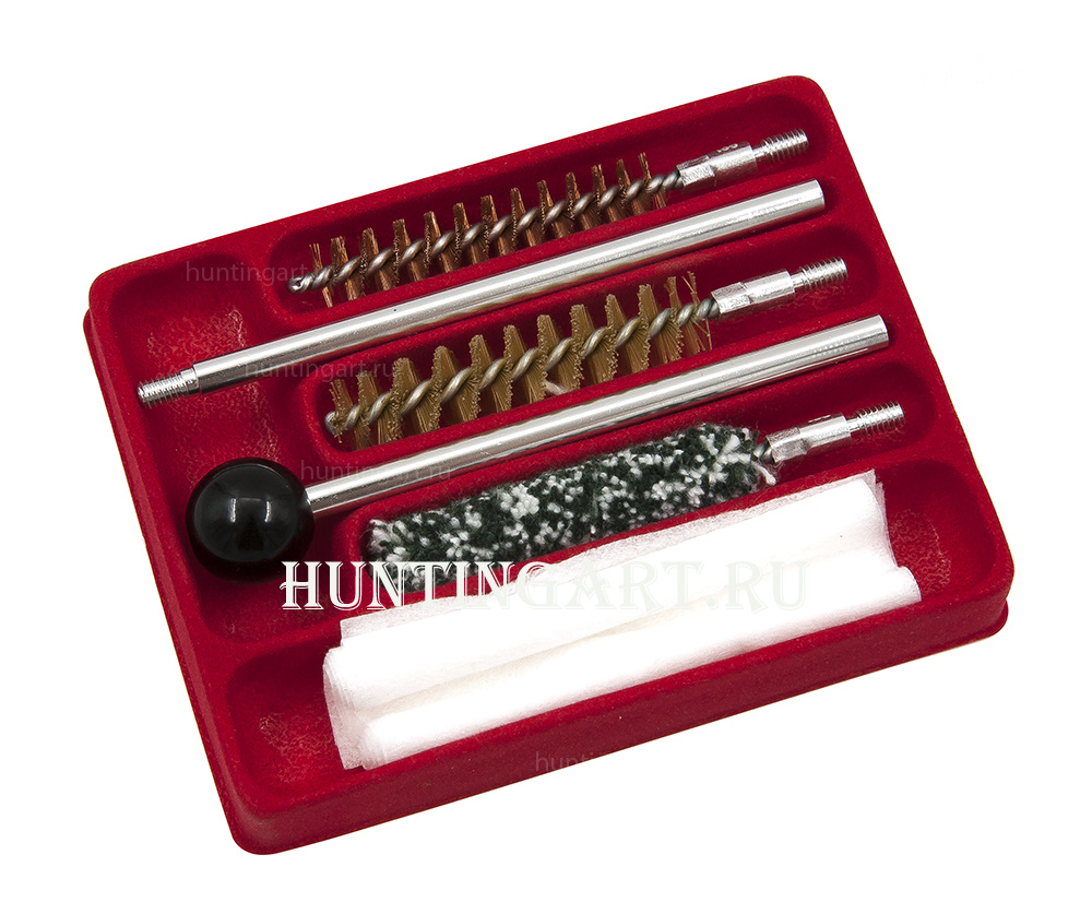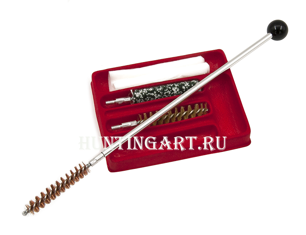 Набор состоит из - разборного алюминиевого шомпола, 3 ершей (шерстяной, нейлоновый, бронзовый) и салфеток. Набор поможет своевременно очистить канал ствола и механизм в целом от нагара, остатков резины, частиц не сгоревшего пороха, что поможет продлить срок службы оружия и предотвратить поломки.