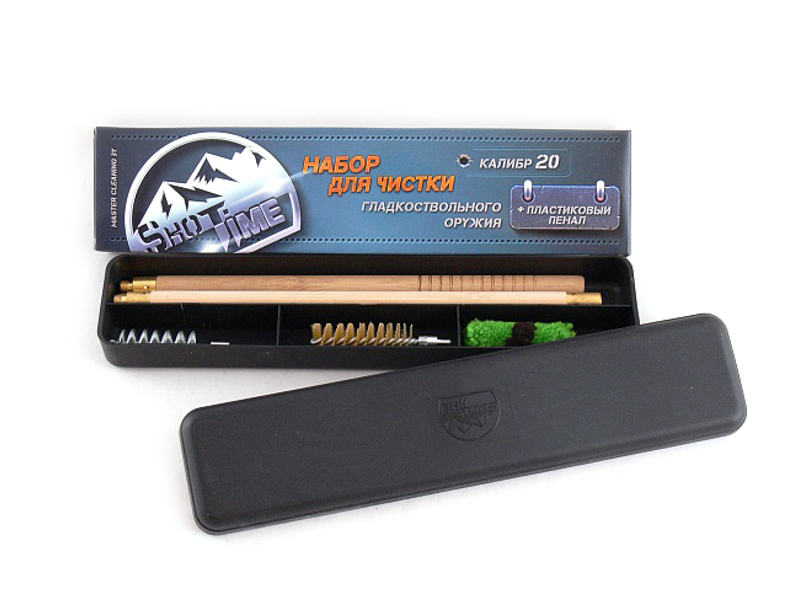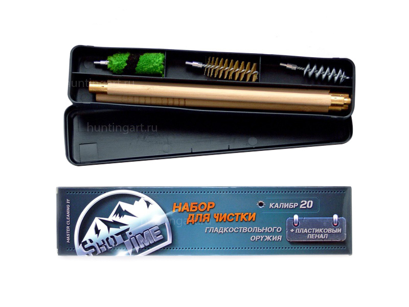 Набор для чистки гладкоствольного оружия ShotTime 20 калибра, составной деревянный шомпол (3 колена) + 3 ерша (пуховка, спираль, щетина) в пластиковом пенале от компании ShotTime.