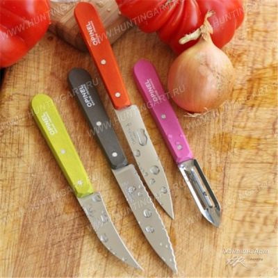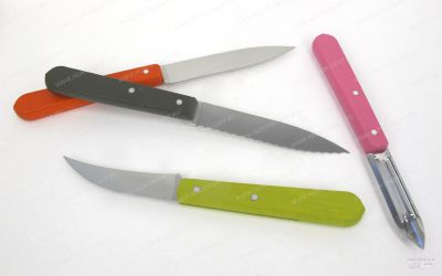 В наборе 4 столовых ножа из нержавеющей стали и цветной рукояти. В комплекте: Нож овощной, лезвие 10 см, Нож для завтрака и томатов, серрейтор, лезвие 10 см., Нож овощной, изогнутый с серрейтором обратной стороны, лезвие 7 см., овощечистка