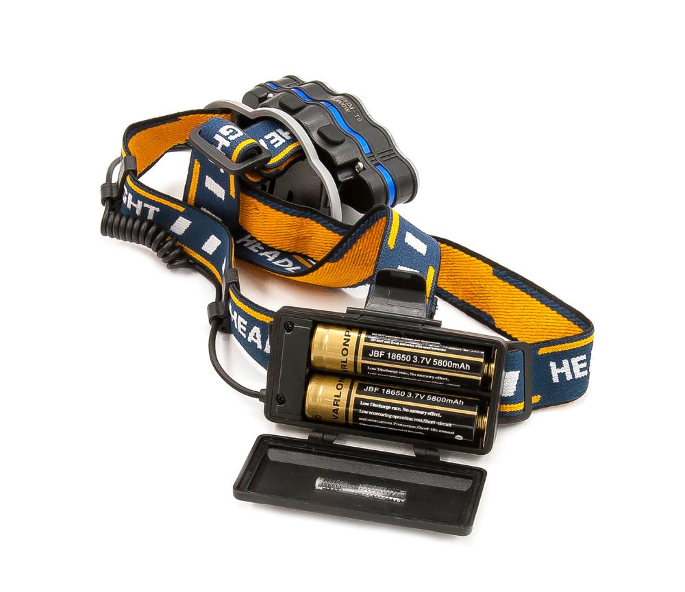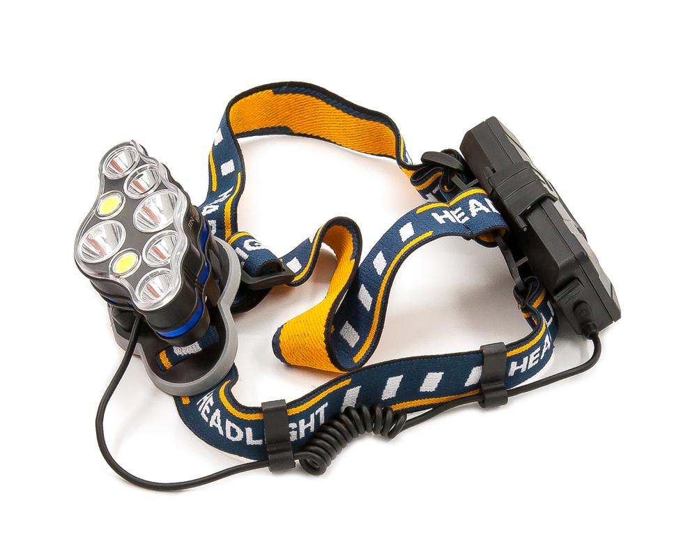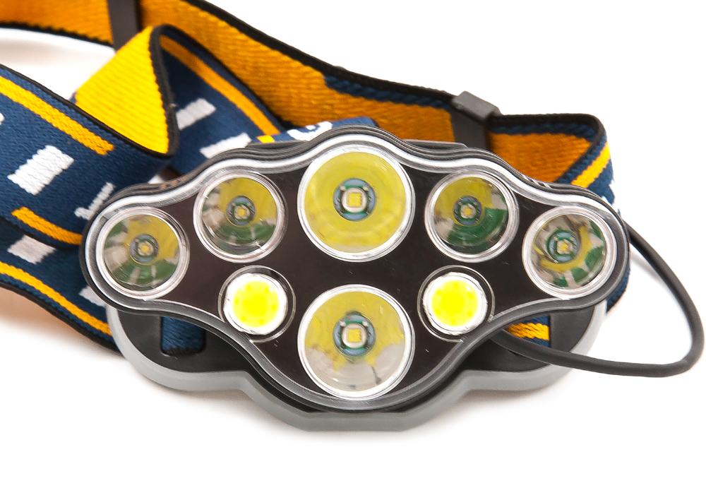 Супер мощный светодиодный налобный фонарь имеет 8 светодиодов. Мощные светодиоды: Cree XML T6 и COB белого и красного цвета для ближнего и дальнего освещения. Общий световой поток 800 Лм.