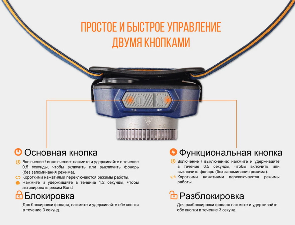 Комплектация: Налобный фонарь со встроенным в корпус аккумулятором, ремешок для ношения на голове, кабель для зарядки.