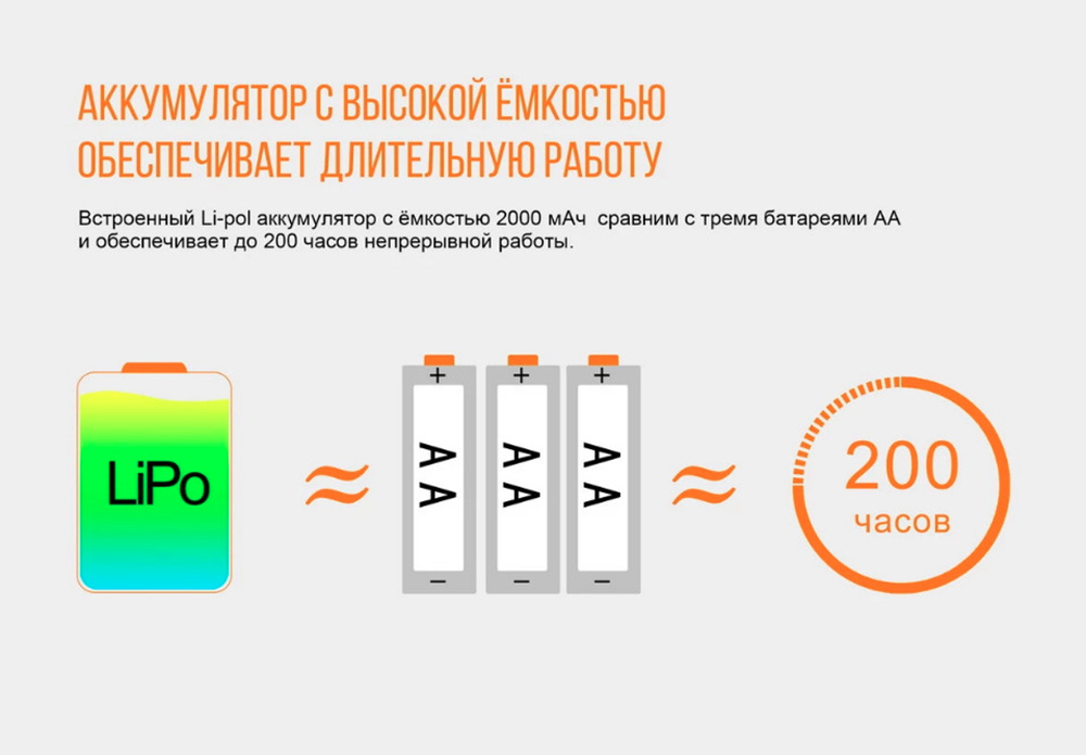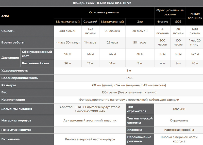 Все данные относительно продолжительности работы фонаря указаны очень точно, поскольку модель HL40R работает с собственным аккумулятором, встроенным внутрь корпуса. Он литий-полимерный, рассчитан на 2000 мАч. Такую емкость можно сравнить с тремя пальчиковыми батарейками, так что фонарь можт действительно долго работать даже с большой яркостью. При этом встроенный аккумулятор очень компактный и имеет небольшой вес, что действительно удобно для налобной модели.