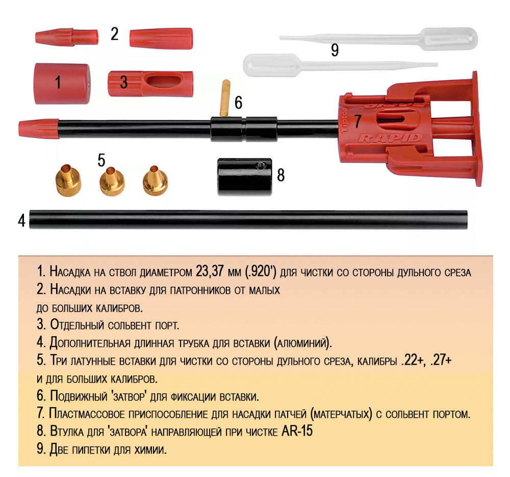- Насадка на ствол диаметром 23,37 мм (.920') для чистки со стороны дульного среза.