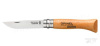Углеродистая сталь ножа менее устойчива к коррозии, на нем могут оставаться пятна и разводы от лимонной кислоты. Углеродистая сталь Opinel — это нелегированная сталь с высоким содержанием углерода, что позволяет ей после термической обработки получить превосходную твердость, гарантирующую отличное удержание кромки, а также высокую устойчивость к износу и легкую повторную заточку. Однако, поскольку углеродистая сталь имеет низкую устойчивость к коррозии под воздействием влаги, при ее использовании необходимы меры предосторожности: не оставляйте нож во влажном помещении, особенно в посудомоечной машине, после использования протирайте лезвие промасленной тканью и часто смазывайте его и его место соединения. На лезвии выгравирована маркировка производителя: эмблема в виде увенчанной короной благословляющей руки, зарегистрированная торговая марка компании с 1909 года.