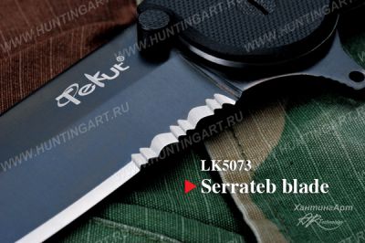 Серрейторная насечка на коротком участке лезвия добавляет к режущим способностям ножа дополнительную силу. Выступы перед рукояткой по обеим сторонам и замок типа Liner Lock защищают руку при работе, требующей усилий. Стальная клипса позволяет носить нож на поясе и не потерять его в глубинах рюкзака. В рукоятке предусмотрено отверстие для темляка.
