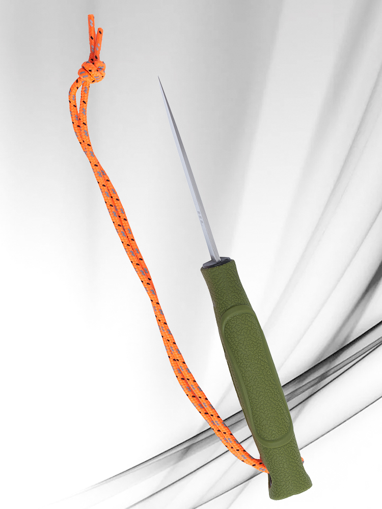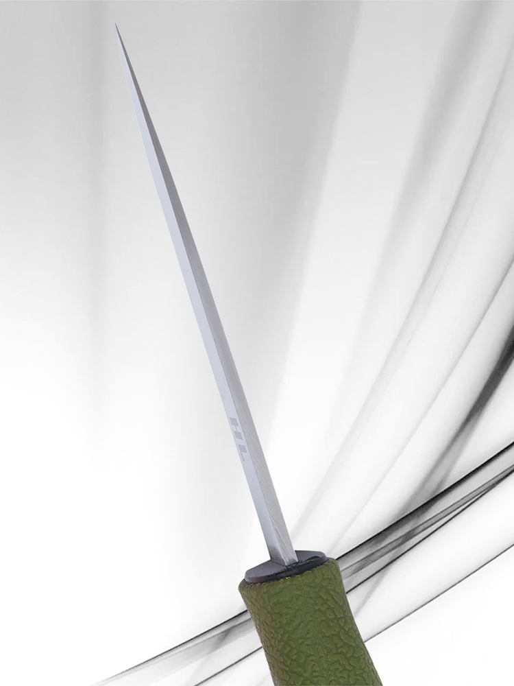 Этот нож оснащен удобной зеленой рукоятью, которая обеспечивает надежный хват во время использования. Общая длина ножа – 223 мм, что делает его достаточно компактным для переноски в походы или на охоту. Толщина клинка составляет 2,5 мм, обеспечивая оптимальную проникающую способность.