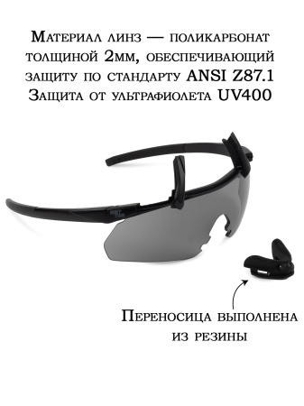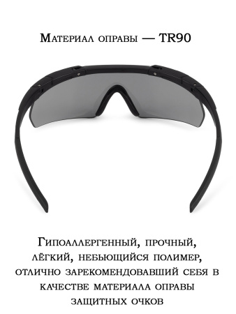 Стрелковые очки имеют переносицу из резины, что обеспечивает комфорт и удобство при ношении. Также они оснащены базовым антифогом и защитой от ультрафиолета UV 400, что гарантирует безопасность глаз при использовании. Очки из поликарбоната толщиной 2 мм обеспечивают защиту по стандарту ANSI Z87.1, что делает их идеальным выбором для стрельбы. Оправа выполнена из TR90 - гипоаллергенного, прочного и легкого полимера, который не бьется и отлично подходит для использования в экстремальных условиях.