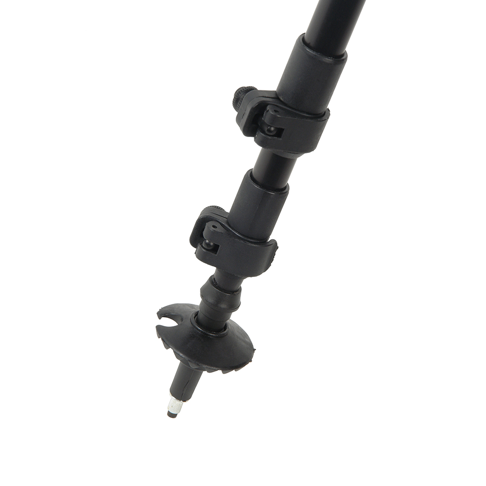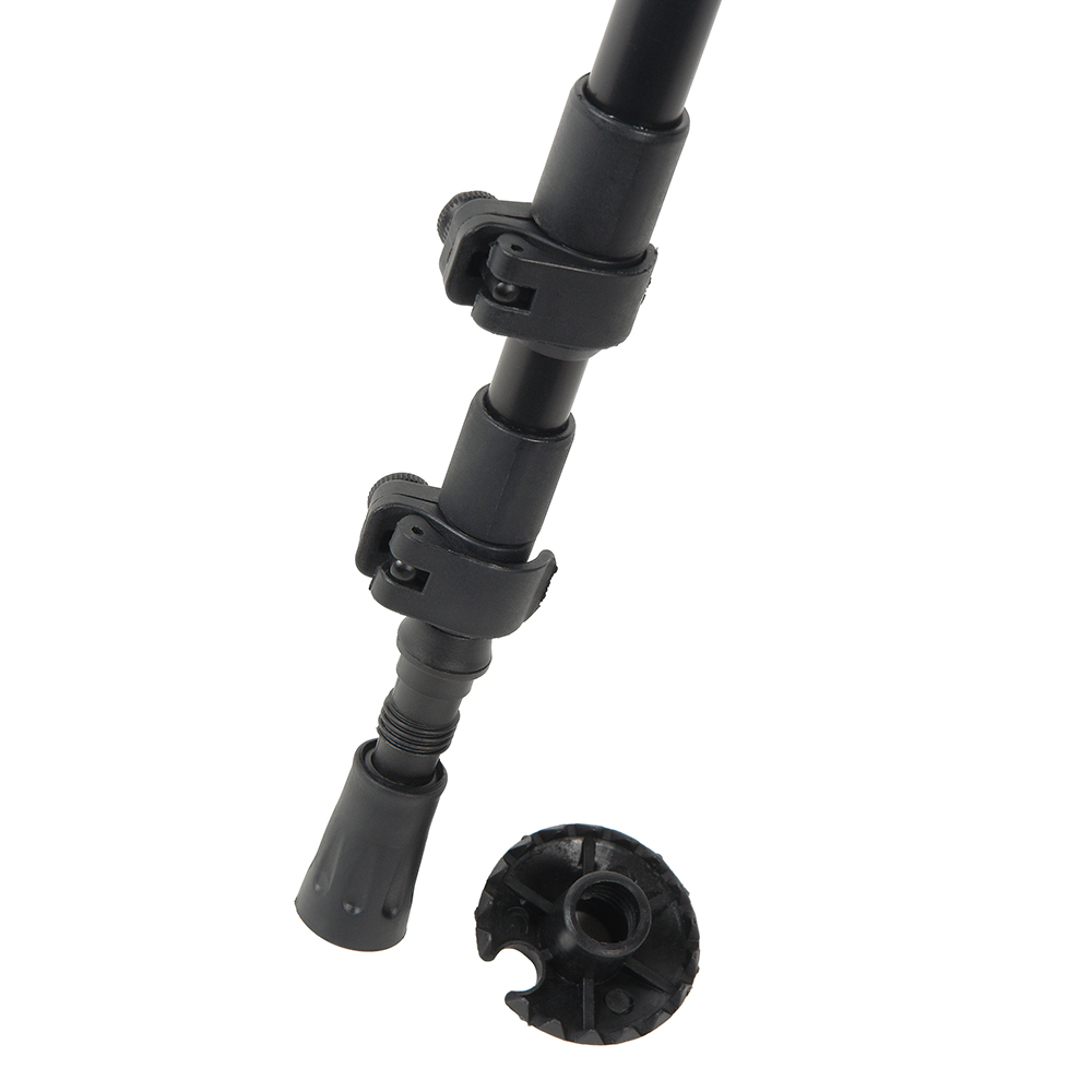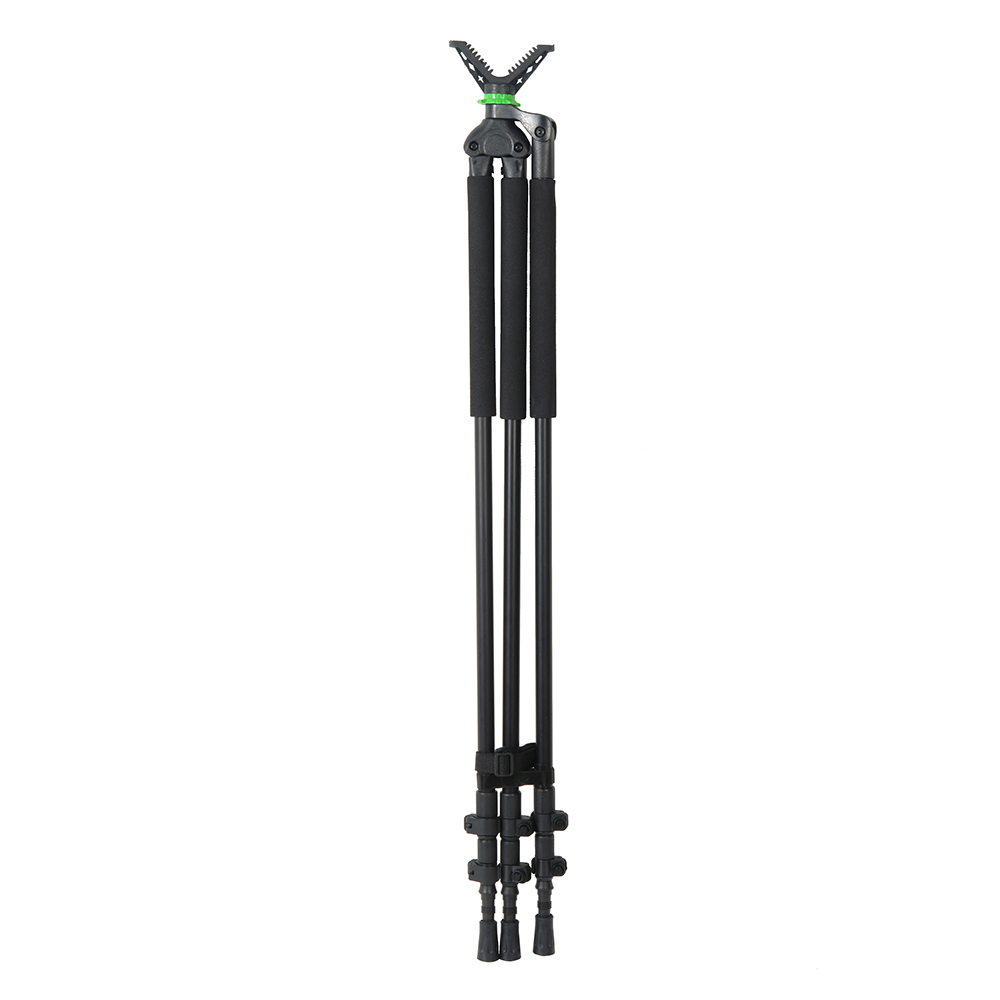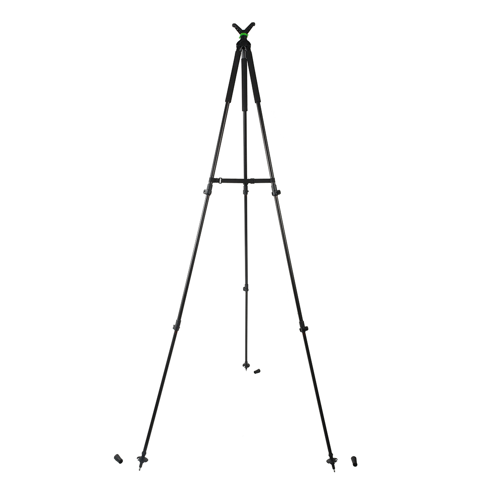 Телескопический трипод состоит из 3 секций. Одна из ног может вращаться вокруг своей оси на 360°, для лучшей устойчивости. Быстро собирается и устанавливается на нужную высоту и «приспосабливается» к любой поверхности. Высота треноги регулируется выдвижением телескопических секций в пределах от 95 до 195 см. Диаметр секций, выполненных из алюминиевого профиля и соединенных клипсовыми зажимами – 18, 16 и 14 мм. Чтобы секции не разъезжались при выстреле, они стянуты предохранительным ремешком. На каждой ноге сделана накладка из пенополиуретана для крепкого хвата, чтобы рука стрелка не соскальзывала. Максимальная нагрузка на опору в рабочем положении не более 5 кг. Пластиковый V – образный упор покрыт рефленой резиной (не скользит и не повреждает поверхность оружия). На концах опоры расположены твердосплавные наконечники со съемными резиновыми ножками. В комплект также входят диски, которые накручиваются на ножки опоры, и не дают триподу проваливаться в снег.
