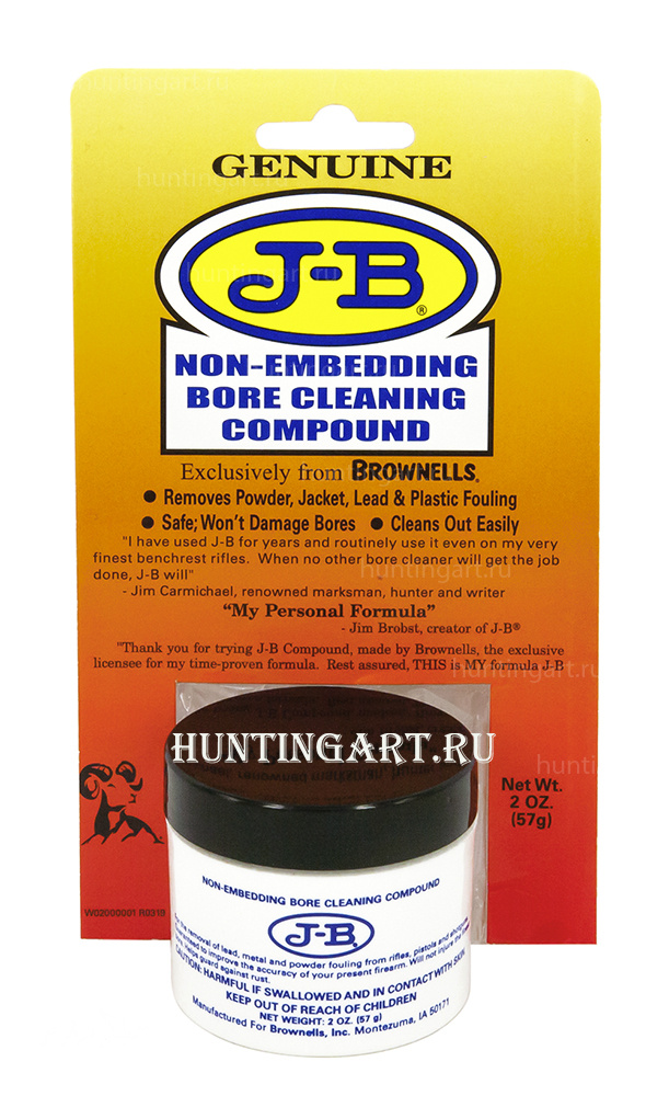 Паста J-B Bore Cleaning Compound используется в качестве препарата удаляющего наслоения цветных металлов с поверхности нарезов оружия. Паста J-B Bore Cleaning полностью очищает канал ствола, удаляя при этом цветные металлы, пороховой нагар и молибденовый налет (если вы используете пули с молибденовым покрытием).