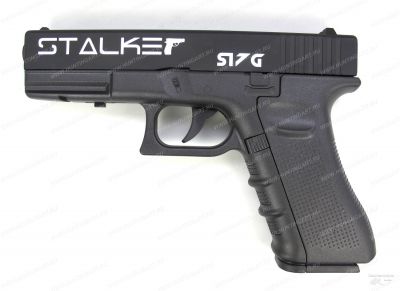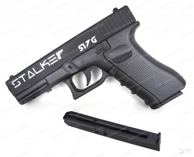 В качестве материала для изготовления затвора пистолета Stalker S17G используется высокопрочный металл, для производства рамы – износостойкий пластик. Эта модель относится к газобаллонной пневматике. Источником энергии служит 12-граммовый баллончик СО2. Пистолет предназначен для учебной и спортивной стрельбы по мишеням, также он подойдет для развлекательной стрельбы. Ударно-спусковая система – полуавтоматическая, в роли снарядов выступают стальные шарики. В магазин вмещается 14 зарядов. Для обеспечения безопасности стрельбы пистолет Сталкер S17G снабжен предохранителем. Скорость пули, вылетающей из ствола, достигает 120 м в сек. Дальность опасной дистанции оценивается в 205 метров. В комплекте с пистолетом поставляется один магазин.