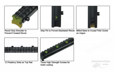 - В конструкции использован специальный винт-стопор для компенсации отдачи. При установке планка фиксируется тремя винтами.