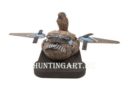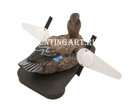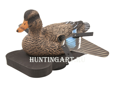 Чучело утки имеет крайне реалистичную степень окраски корпуса и выполнено из износостойкого EVA пластика ("ЭВА" - этилвинилацетат), который устойчив к трещинам. Крылья изготовлены при помощи инжекционной формовки, что обеспечивает их гибкость и прочность. На крылья нанесен фотореалистичный рисунок, а так же имеются специальные ремешки-брызговики, для создания брызг на воде. Крепятся крылья с помощью магнитного крепления, которое не только обеспечивает быструю установку, но и делает движения легче, что позволяет батарее работать дольше. Устанавливается приманка на прочную пенистую подушку/платформу, черного цвета, для устойчивого нахождения приманки на воде.