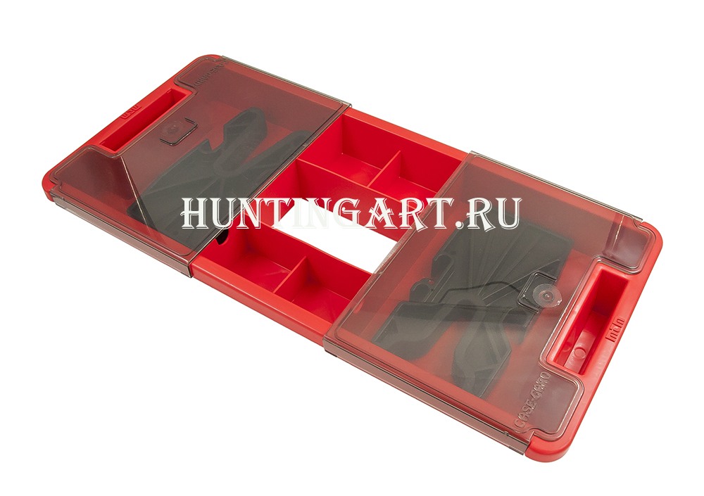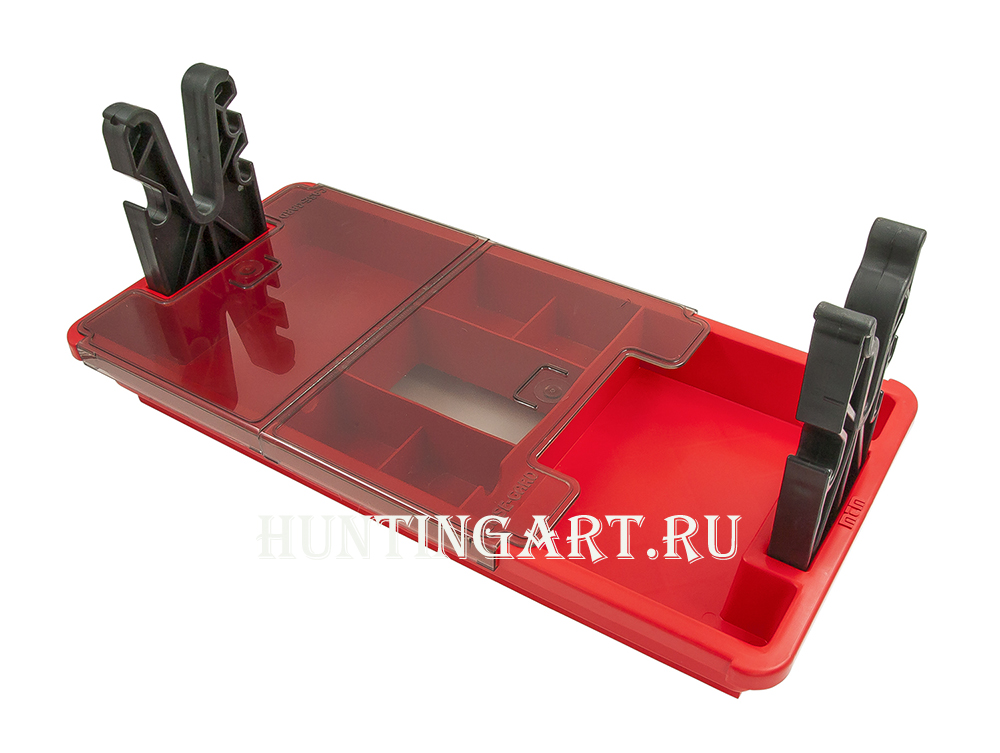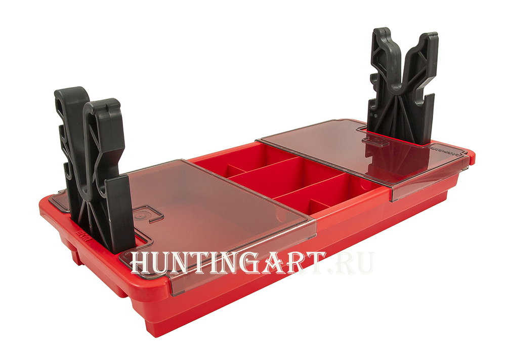 Центр состоит из неглубокого поддона ярко-красного цвета и двух чёрных подставок для фиксации оружия. Форма внутренней части подставок обеспечивает наклон оружия в сторону дульной части ствола, что необходимо для удобства чистки и предотвращения затекания агрессивной «химии» в ствольную коробку оружия. При необходимости центр Compact в процессе хранения и транспортировки может быть использован совместно с пластиковым ящиком для стрелковых аксессуаров A-760-40 Shooting Accessory Box. То есть, вы просто ставите один ящик на другой и переносите их одновременно. В центральной части поддона «Компакта» имеется сквозное отверстие прямоугольной формы, предназначенное для ручки «Бокса».